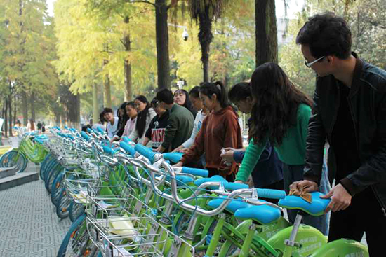 “文明使用共享单车、勇于制止不文明行为,体现新时期老员工的道德修养和社会担当。希望今后师生能共同维护校园秩序、享受美好城市资源。”志愿者汪康现场发起文明使用共享单车倡议。