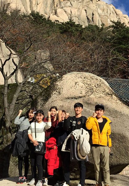 周末,交换生黄羽琦(左一)、何丽(左二)、邓芬(左三)、陈铃(右三)与韩国同学结伴到雪岳山国立公园游览。