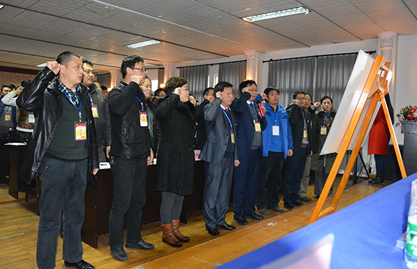 最后,全体代表起立,举起右手,由梅平经理领誓,重温入党誓词。