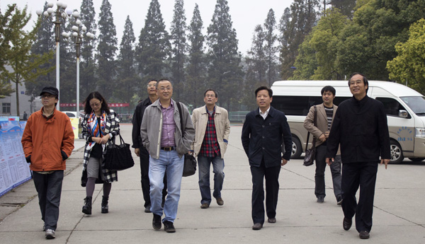 我国著名作家刘醒龙(前排左二)、文学评论家朱小如(后排左三)、作家许辉(后排左二)、小说家、诗人叶舟(前排左)、文学评论家李美皆(后排左)在公司经理王金琼(前排右二)、沈光明教授(前排右)的陪同下参观校园