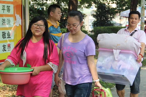 校园里,人头攒动,火辣的太阳丝毫没有降低志愿者的工作热情,校园各处总能看到身着粉红色T恤的志愿者活跃的身影,及时为新生及家长引路、送水、搬行李,为他们送去温暖。