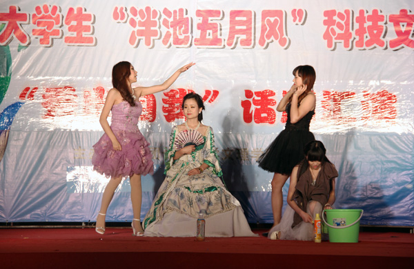 院团委选送的节目《威尼斯商人》,将莎士比亚的经典之作搬上舞台,带给观众们独特的视觉体验。演员们夸张的表情,戏虐的口吻,引得台下观众纷纷起身鼓掌;经典的童话故事《灰姑娘》被赋予了时代的气息,女生们动感的舞蹈,投入的神情及“高富帅、白富美”、“打败你的是无鞋”、“我为自己代言”等新兴网络名词被客串引用到剧本中,引得师生们捧腹不禁。