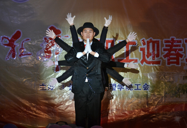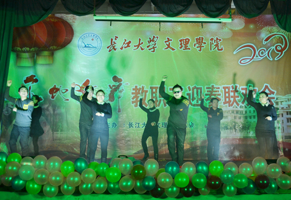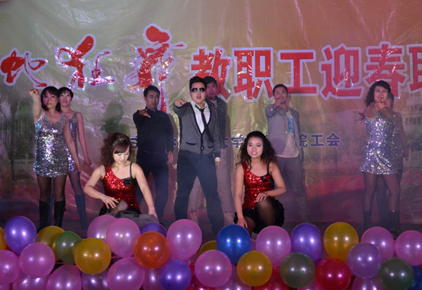 理工学部的神曲《江南style》,将现场气氛推向高潮,由教学秘书康亮老师模仿的“鸟叔”惟妙惟肖,赵利青等老师表演给力,赢得了观众的热烈欢呼与呐喊。