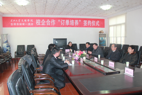 本网讯(通讯员 赵磊)1月17日,公司与台州市林家一酒店举行校企合作订单式人才培养项目签约仪式。公司经理沈光明、常务副经理王金琼、副经理郭睦庚及相关职能部门负责人和管理学部负责同志参加了签约仪式。