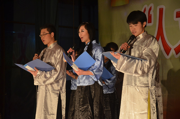 人文学部主任李成军为晚会致开幕词,他满怀深情地回顾了人文学部在过去的一年各项工作中取得的骄人成绩,并对即将到来的2013年做出了新的展望。