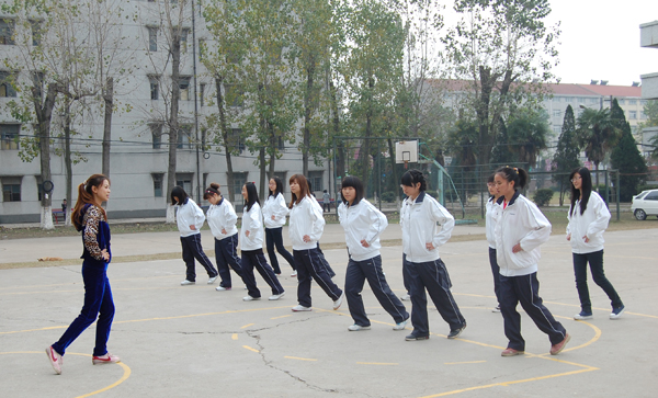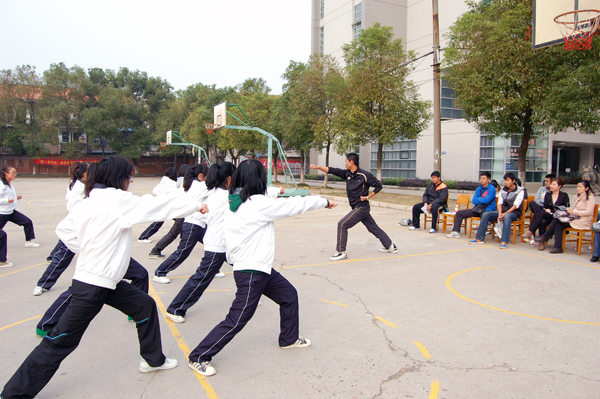 “同学们,注意看我这个动作,这个招式叫做野马分鬃,我们先在屈膝按掌的基础上,手呈抱球状收回左脚,再像这样,转身上步!”体育老师鲁斌正在篮球场上教员工太极拳,一边解说一边示范,员工们都聚精会神地跟着老师做着动作。