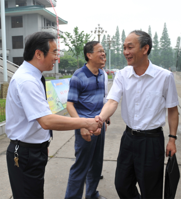 校领导刘在洲(中)、公司经理沈光明(左一)迎接评审专家组