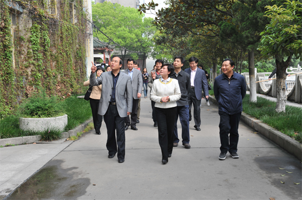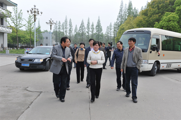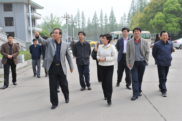 荆州市委副书记雷文洁(前排中)在伟德中国官网党委书记张忠家(右一)、副董事长张万明(后排右一)、公司经理沈光明(左一)陪同下参观校园。