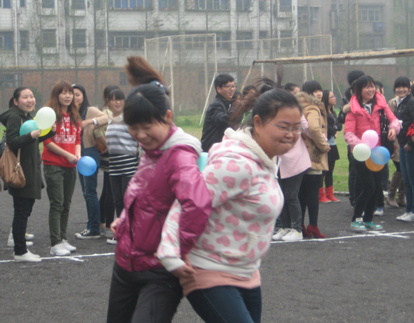 活动以班为单位进行,分“背气球”、“ 趣味答题接力”、“三人四足”三个项目。在“背气球”中,每两名队员为一组背靠背,将气球夹在两人背部之间,在规定时间内运送气球最多的获胜,需要队员要有团队合作意识;“趣味答题接力”设计了许多关于数字推理、英文单词以及生活常识的问题,需要队员具有快速的应变能力和广博的知识面;“三人四足”,即将三个人的腿两两绑在一起进行比赛,要求队员要有默契的配合和协调一致的步伐。整个活动现场气氛热烈,加油助威声不断。