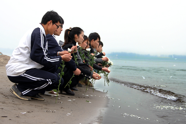 同学们思念英雄的情绪,弥漫在江滩上空;同学们传承美德的决心,更在前来祭奠的人们心中传递。