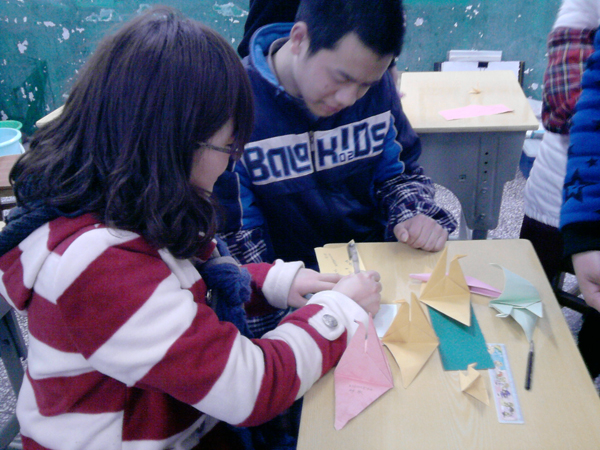 在活动现场,青年志愿者们向几十名残疾儿童送上了彩笔、彩纸、水粉、橡皮泥等礼品,希望他们能够健康成长。随后,志愿者与小朋友们开展一对一交流活动。志愿者们有的与小朋友一起动手进行手工制作,有的手把手教小朋友画画,有的甚至与小朋友下起了跳棋。整个活动现场其乐融融,不少小朋友还将自己的手工作品、绘画作品向志愿者们展示,以表达他们的感激之情。最后,志愿者与小朋友们一起叠起了千纸鹤,并写上希望和祝福。