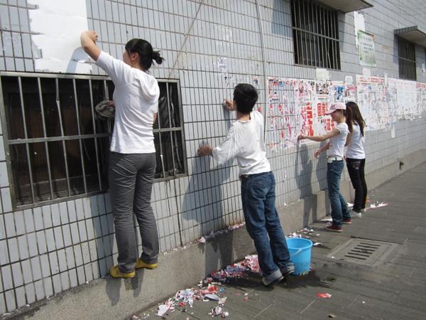 本网讯(通讯员 张自兰)在“五一”劳动节来临之际,管理学部员工党员对校区进行了一次大清扫。 4月29日下午2时,管理学部员工党支部全体成员在一教前集合,大家分成四个小组,带着劳动工具奔赴校园各个角落进行大扫除。 “我是一个粉刷匠,粉刷本领强……”一阵歌声从第一、二小组中传来。 原来是会计5085班的池欢边唱歌边清扫墙壁上的小广告,这种情绪感染了周围的同学。 “迎五一,向劳动者致敬。校园清扫只是一个小部分,我们还有很多事可以做,劳动光荣!”该学部员工党支部书记尤金荣告诉记者。 (责任编辑 周芳)