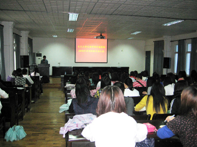 会上,九位考研优秀代表结合自己的考研经历就报考公司、专业方向、考研心态和学习方法等方面与学弟学妹们做了交流。激励的言辞、中肯的建议及精辟独到的学习方法给在场每一位同学和老师留下了深刻的印象。英语5063班的李卫刚刚考取了华中师范大学,他指出,考研最重要的在于坚持,在于心态的调整,其次是与研友的合作与交流,相互鼓励和扶持,还有合理科学的计划和良好的身心状态。他们发自肺腑的话语和切实中肯的建议使在场的学弟学妹们对考研有了一个全新的认识,赢得了大家的阵阵掌声。