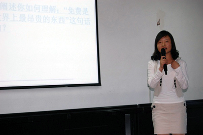经过初赛、复赛的层层选拔,最终有10名同学脱颖而出,他们将在主题演讲、即兴表演、才艺展示和评委问答等四个环节进行激烈角逐。对于青春这个话题,选手们用精彩的语言诠释着对它的理解,时而婉转低回,时而激情澎湃的表演一次次给观众带来惊喜。当幻灯片上闪现出10•24救人事件中3位英雄的年轻脸庞,一幅幅揪心的画面再次牵动了在场的每位同学,来自英文组的陈博文同学说道:“三位英雄用实际行动向我们证明了青春的最佳定义,他们用自己年轻的生命向世人展示出当代老员工的风采,所以他们的青春是精彩的”。随后,在个人才艺表演中,他幽默的语言,夸张的动作将现场气氛推向高潮;“青春是道明媚的忧伤,青春又是绚烂的彩虹,任我们挥毫洒墨,涂上最美的颜色……”,中文组的小张同学用充满诗意的语言及饱含深情的朗诵赢得了观众雷鸣般的掌声;来自基础学部的张花同学在演讲结束后面对评委的提问作了精妙的回答,赢得了现场观众的好评。