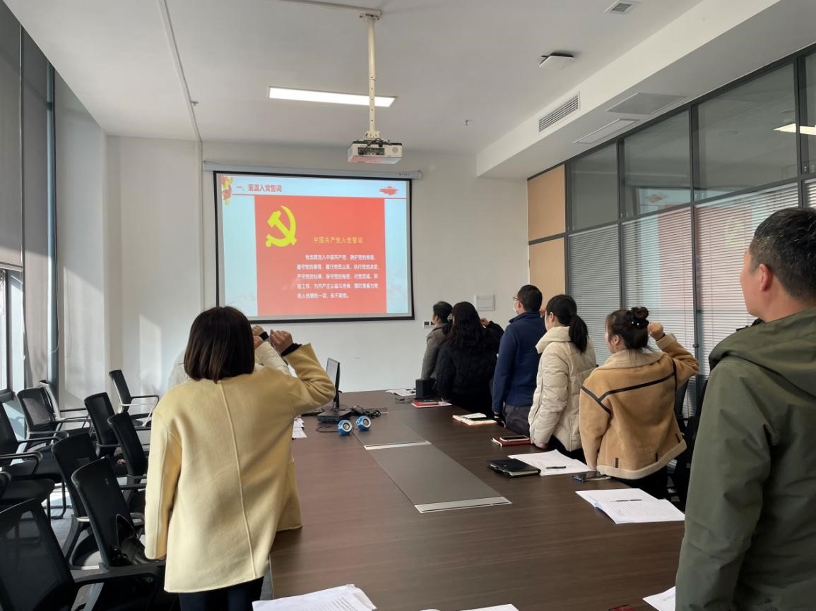 在支部主题党日活动中,全体党员重温入党誓词、缴纳党费、集体诵读《中国共产党章程》第十章和第十一章。